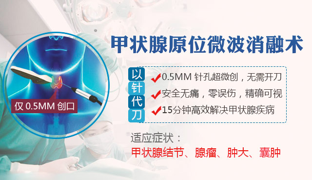 甲状腺原位微波消融术无需全麻在可视超声智能定位仪下采用0.5毫米的微波离子消融针靶向介入到甲状腺病变组织内(无需开刀),用高温将结节、囊肿、腺瘤等进行灭活,10分钟内即可完成手术,术后已消融的结节病灶在短时间内自身吸收、消失,手术创口仅有几毫米如针孔般大小,数天可自行消失,无疤痕几乎不影响美观。点击了解微诊疗方法的治疗过程,医生为你详细介绍